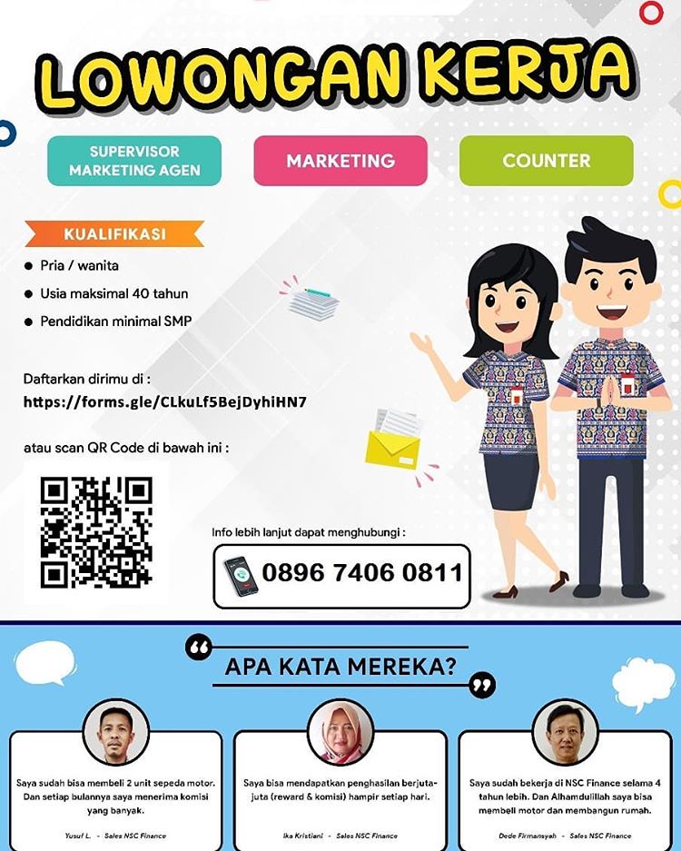 Saat ini NSC Finance Kragilan sedang membuka lowongan kerja untuk mengisi posisi sebagai :