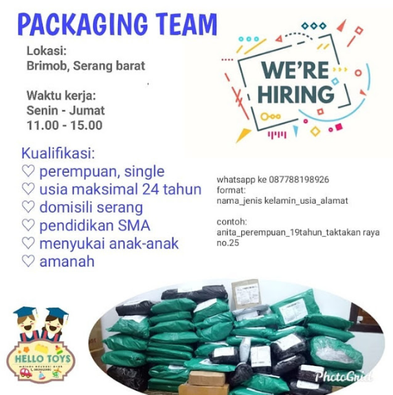 Info Loker Serang Hello Toys sebagai toko mainan yang di jaual secara online, sebagai distributor resmi dari Education Toys, kami selalu berusaha untuk memberikan yang terbaik bagi pelanggan.